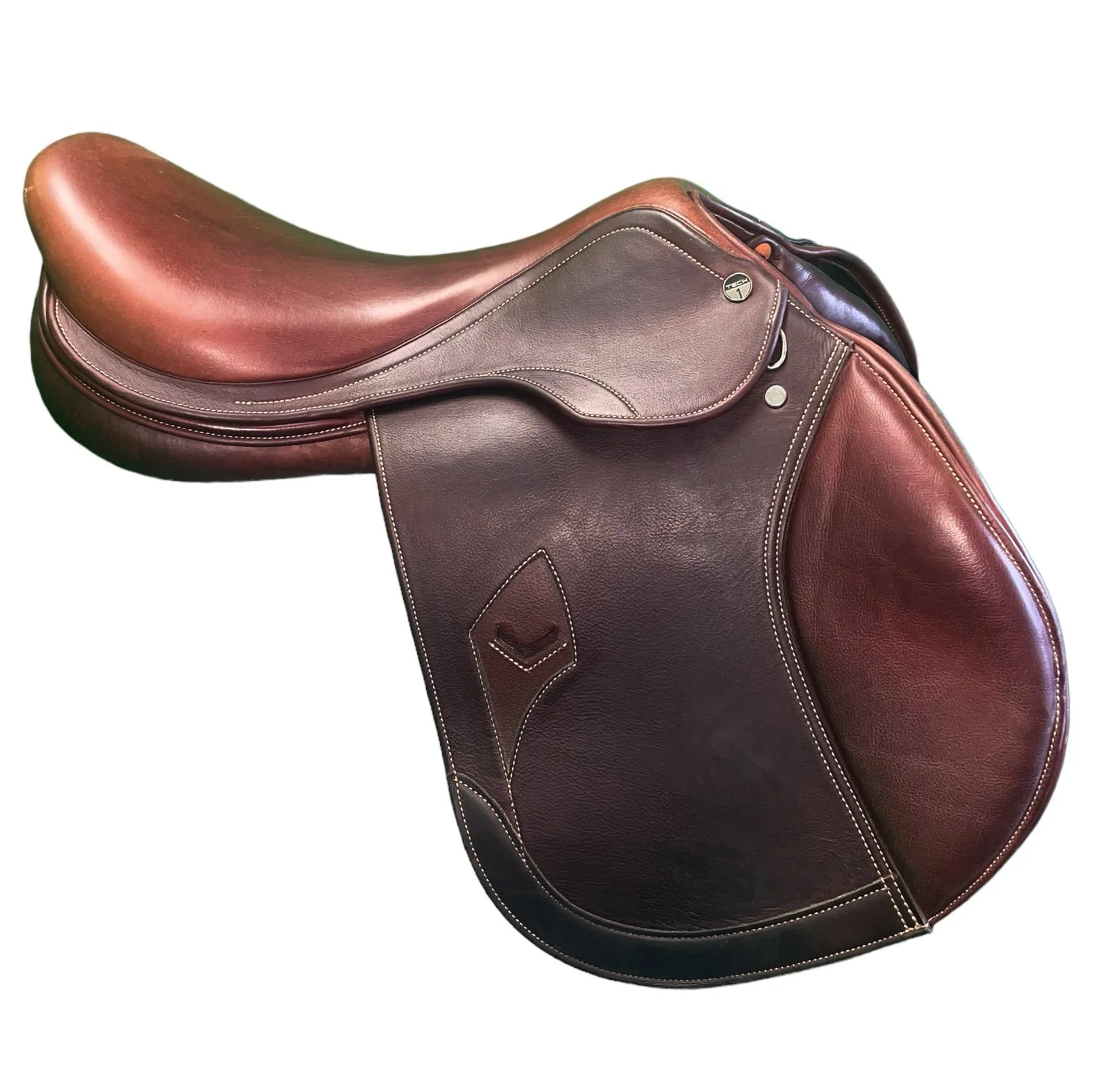 Deep seat jumping saddle made on a fiber tree suitable for the majority of show jumping horses. Thanks to the big or small front Velcro blocks, this jumping saddle gives a safe riding position to both professional and amateur riders. Has been converted to back velcro blocks as well.